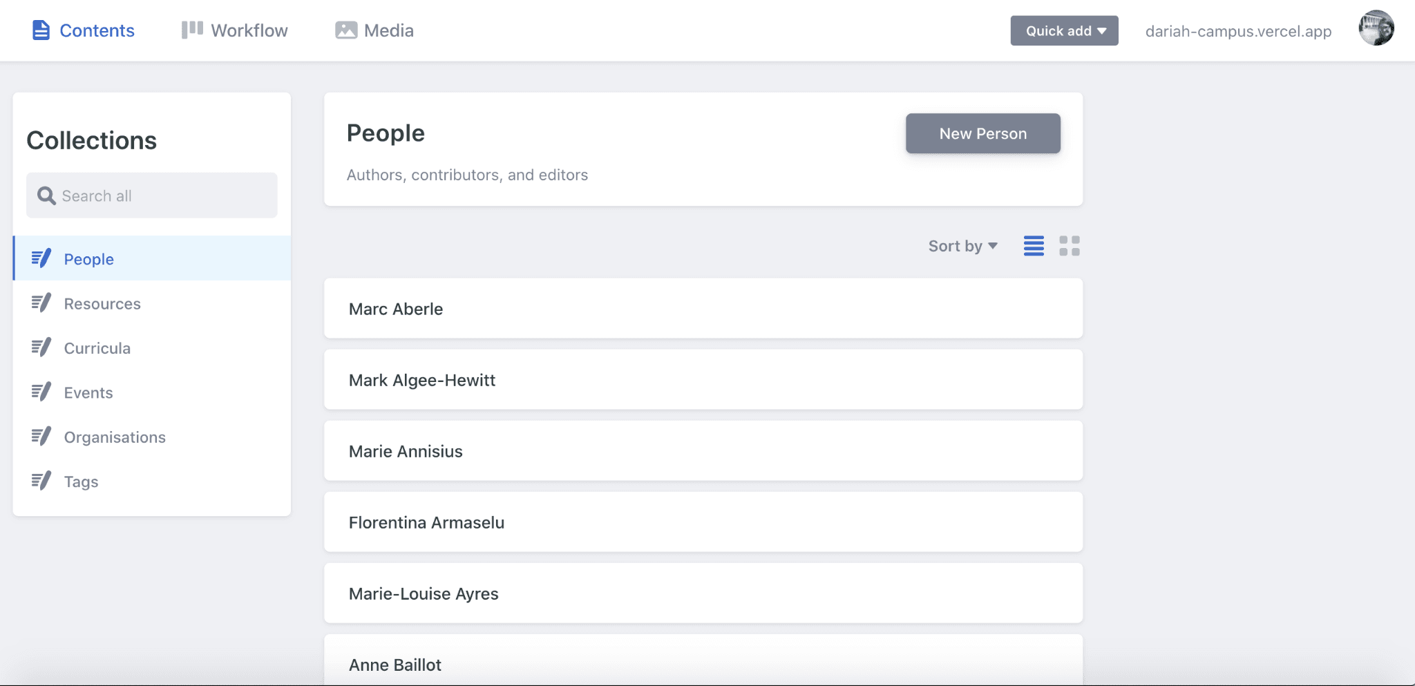 The first thing you will see here is the ‘People’ tab, and the option to create a ‘new person’. Ideally you will have already completed step one, and therefore will not need to do this. However, be sure to scroll down through the list to check that all your authors are in this list. This is a good opportunity to add an image to their profile as well, so that this appears on the DARIAH-Campus listing properly.