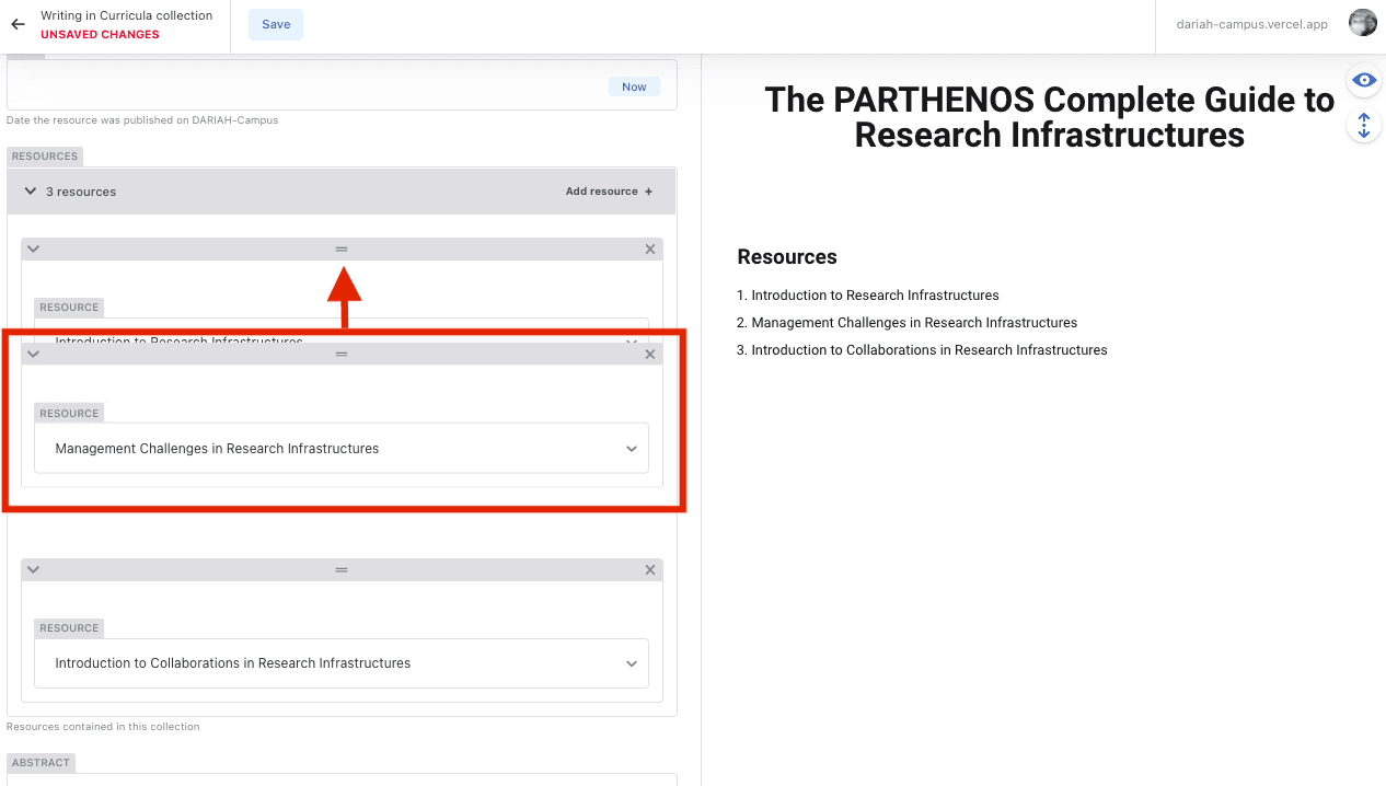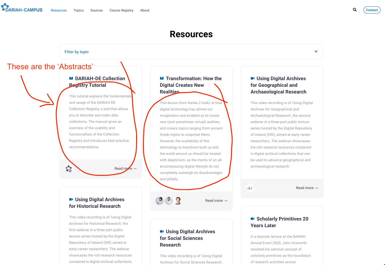 - The ‘Abstract’ is a required field, as this is what shows up in the listings of resources on the main DARIAH-Campus page. You will not see a preview of this here, so it’s important that you make sure everything in this is correct, check for any spelling errors and/or typos. The abstract should be no longer than around 50 words, and should indicate to a potential student what they will learn within the resource.