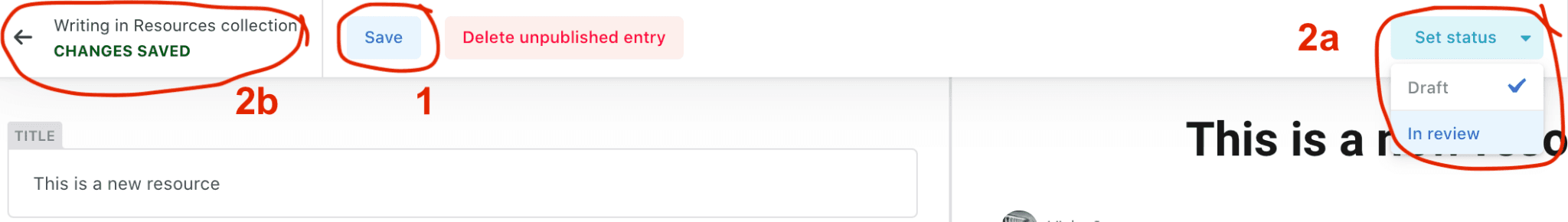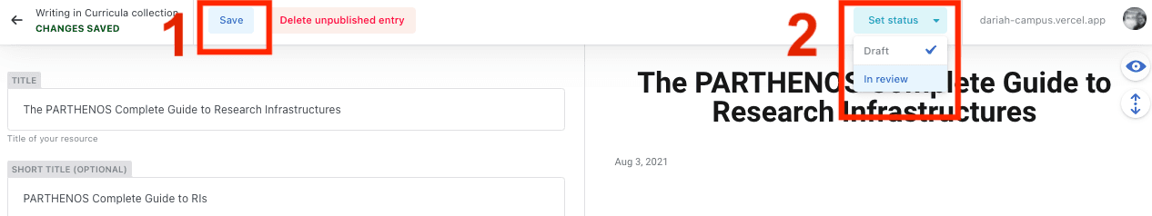 2a) If you’re absolutely sure that you don’t need to make any more changes to this, you can go to the ‘set status’ button in the top right, and select ‘In review’. This will push the resource into the queue for publishing.