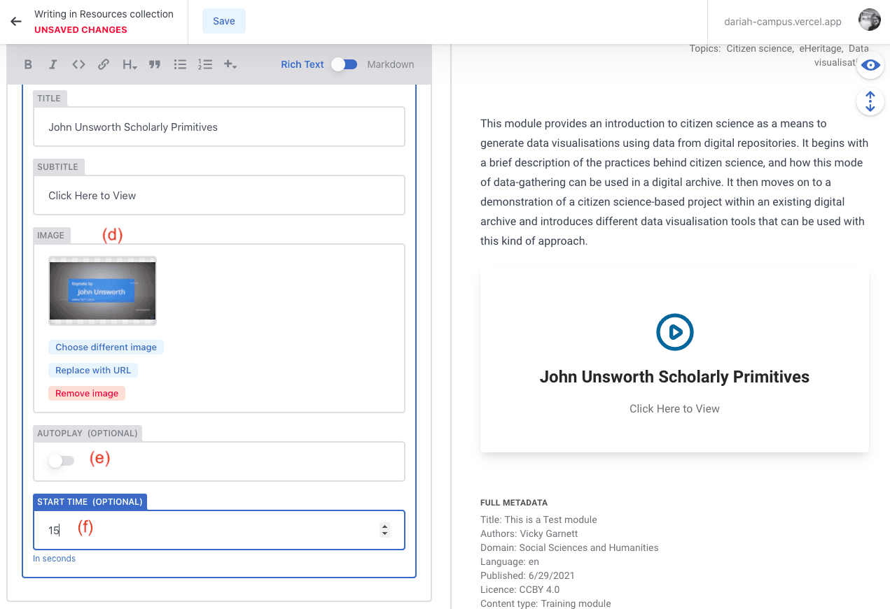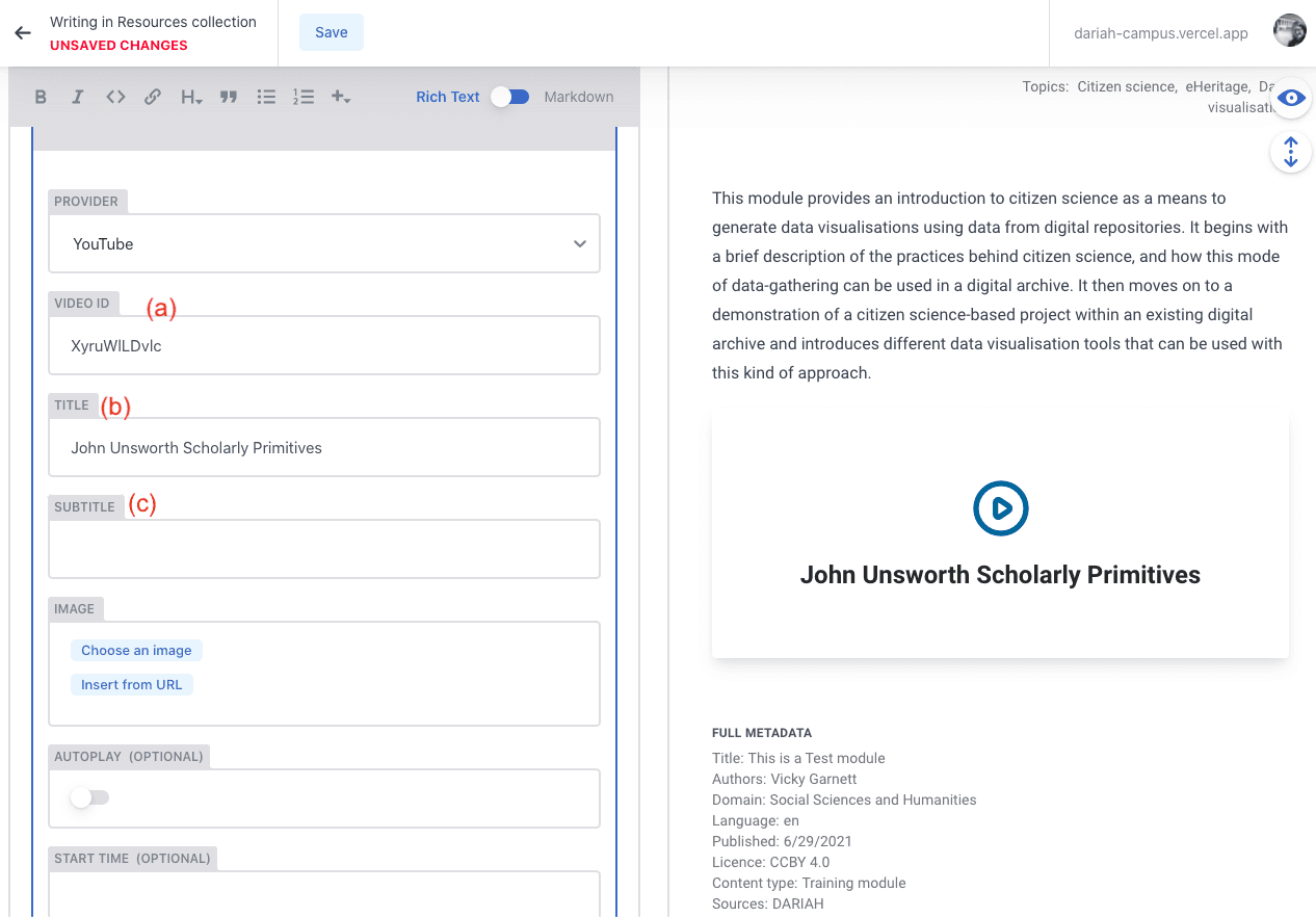 - This will bring you to a page with a form with two columns: a form on the left hand side, and a preview panel on the right. As you add items, you will see that the preview panel will start to display them so you can see how they will show up on the main DARIAH-Campus site.