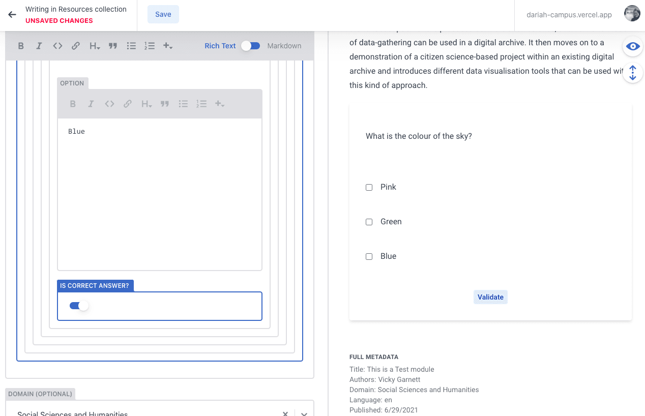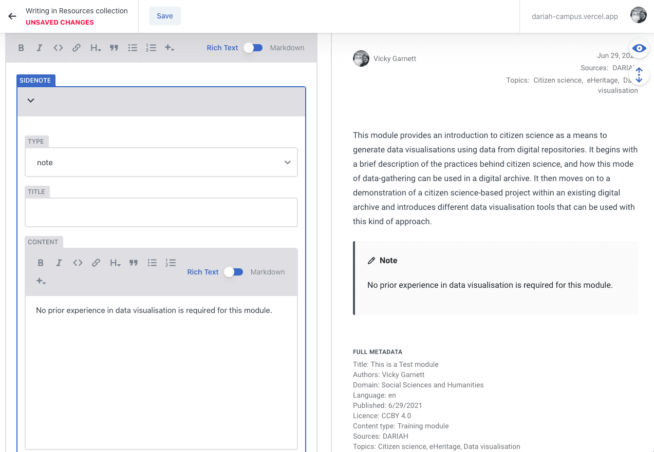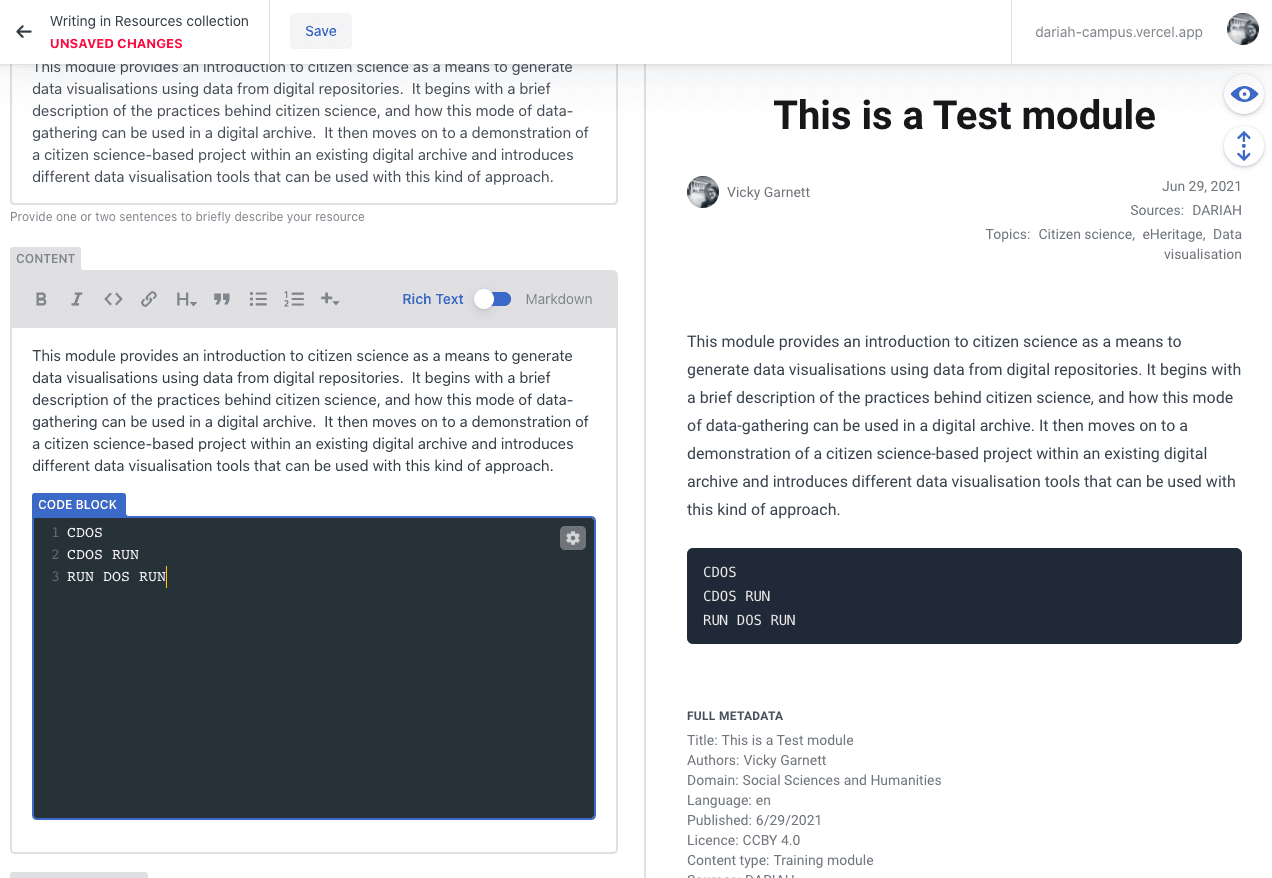 The following walk-through is specific to the Rich Text option, but even if you choose to use Markdown, there are some requirements. These are listed at the end. Users can toggle between Rich Text and Markdown, which can be a useful feature, particularly when it comes to the resource type templates.