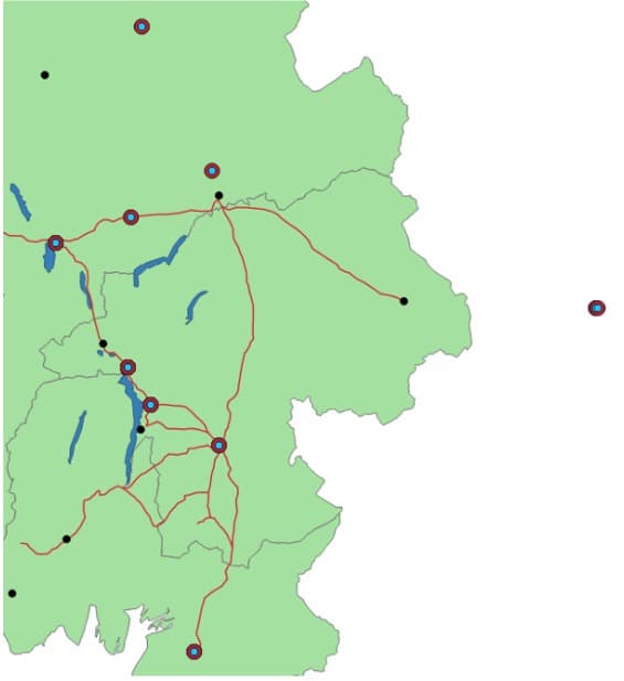 This will add a new layer to your QGIS project called ‘Joined layer’. As you might expect, this produces a point layer that (most likely) shows exactly the same locations that you were able to georeference within Recogito (mirroring your Wordsworth-Recogito layer). You can see this is the case on the example image to the right, with the larger red dots showing the Joined layer, and the lighter blue dots showing the Wordsworth-Recogito layer.