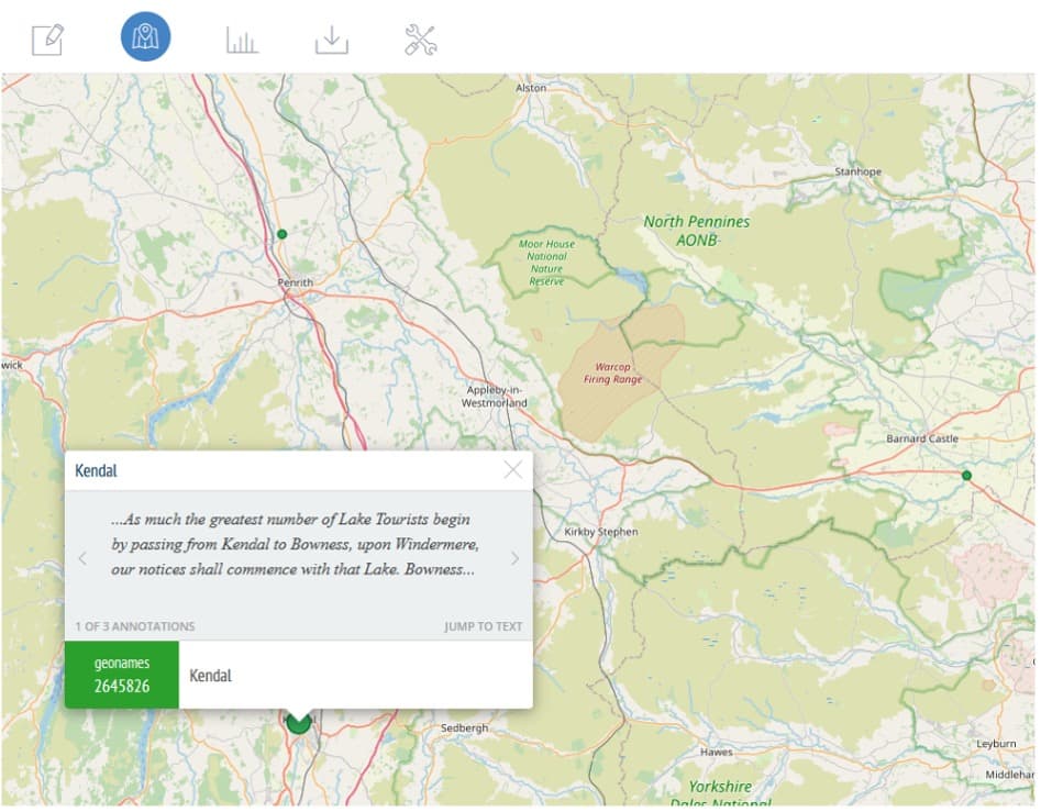 - Recogito uses multiple gazetteers, so the first ‘Automatic Match’ may not always be correct, or it may not be able to identify any match at all. To see what this looks like, annotate Rokeby (a few lines after Penrith)