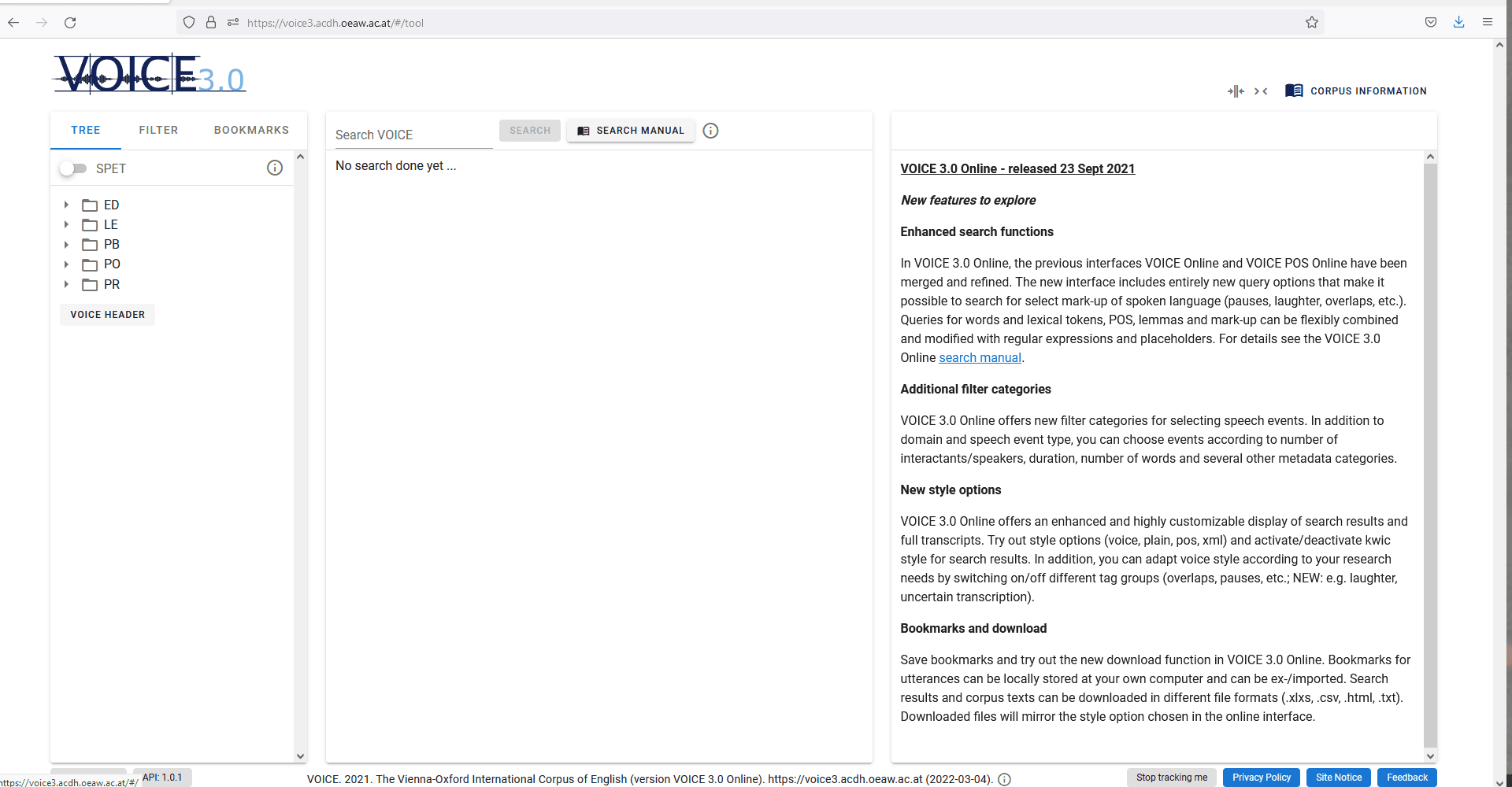 The VOICE corpus was created between 2005 and 2013 at the University of Vienna with funding from the Austrian Science Fund (FWF) to provide a source for linguistic research that does not concentrate on English as spoken and written by speakers of English as first language, but instead focuses on the use of ELF, the most-wide spread contemporary use of English throughout the world. Since its first release in 2009, VOICE texts are stored in TEI-based XML format and rendered accessible online through an online user interface. Between spring 2020 and autumn 2021, a new TEI-XML version of VOICE (VOICE 3.0 XML available in ARCHE) was created and a new open-access user interface, VOICE 3.0 Online, was developed with funding from CLARIAH-AT. This interface, released in autumn 2021 at the Austrian Centre for Digital Humanities and Cultural Heritage (ACDH-CH), offers search facilities, expanded filter and style options, an improved bookmarking tool and new download functions that will be explained in this chapter.