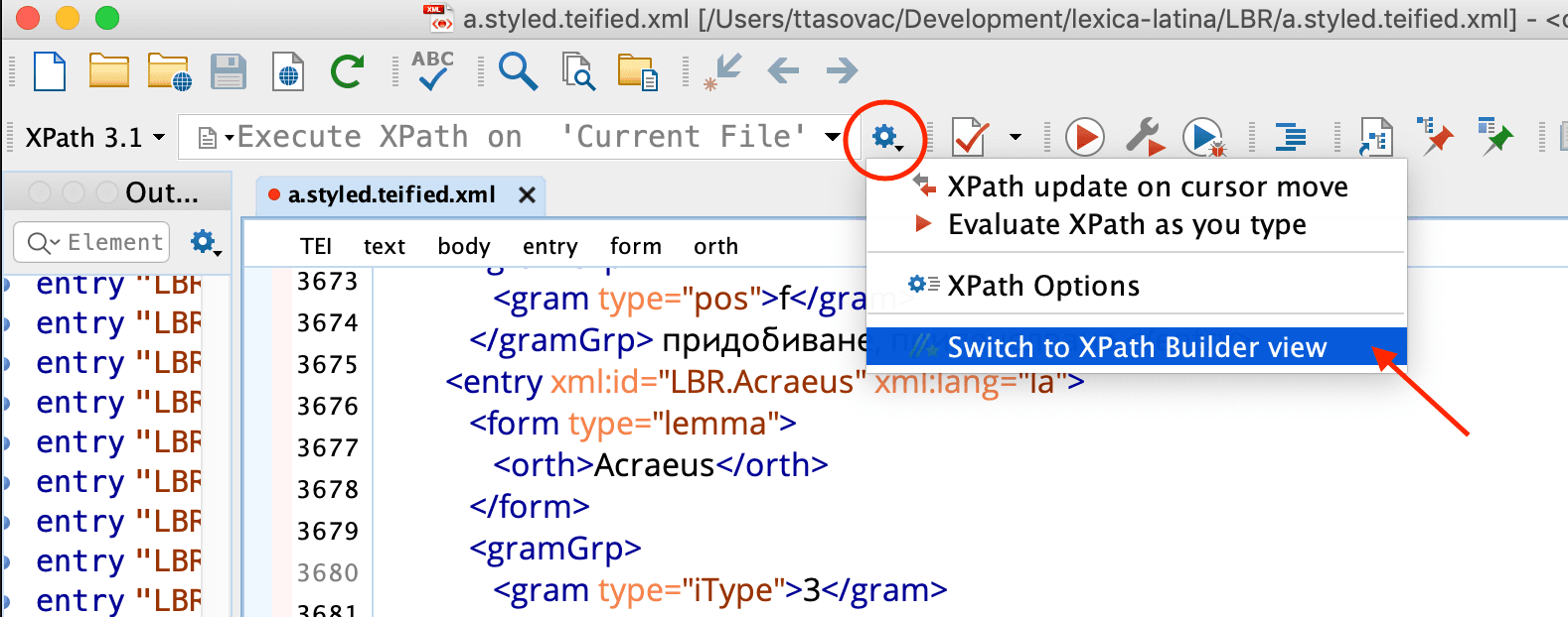 //★and is positioned in the right-hand corner of the XPath input, or - in the newer versions of oXygen, click on the icon next to the XPath input field and select the “Switch to XPath Builder View” from the dropdown menu, like this: